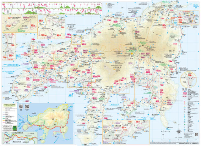 While the Shikoku 88 temple pilgrimage takes over 40 days to walk, the Shodoshima 88 temple pilgrimage can be completed within a week—one of the many benefits of a small island. Also, there are many isolated sites, and one can feel the ocean breeze even from the tops of the mountains. Shodoshima boasts a strong, traditional culinary culture and industry, attractive hiking courses, rock climbing spots, beaches, and beautiful ocean scenery. This map includes information for all of these sights to help you enjoy the whole island.